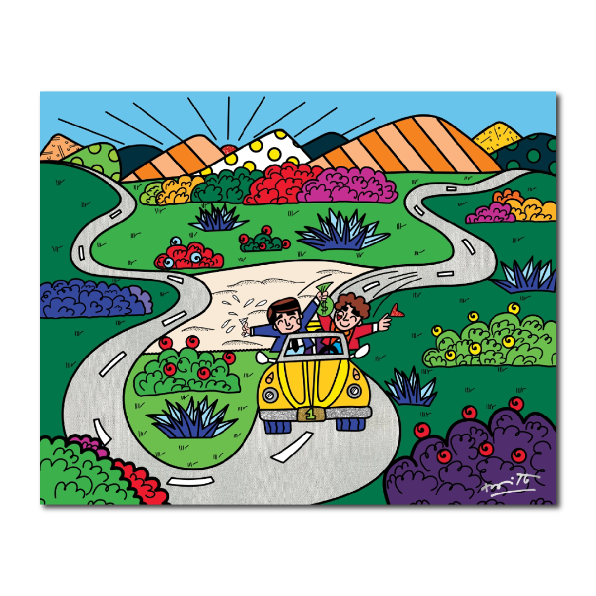 鮮やかな色彩と輝きが調和したキャンバスには、ロメロ・ブリット本人による直筆サインが添えられています。