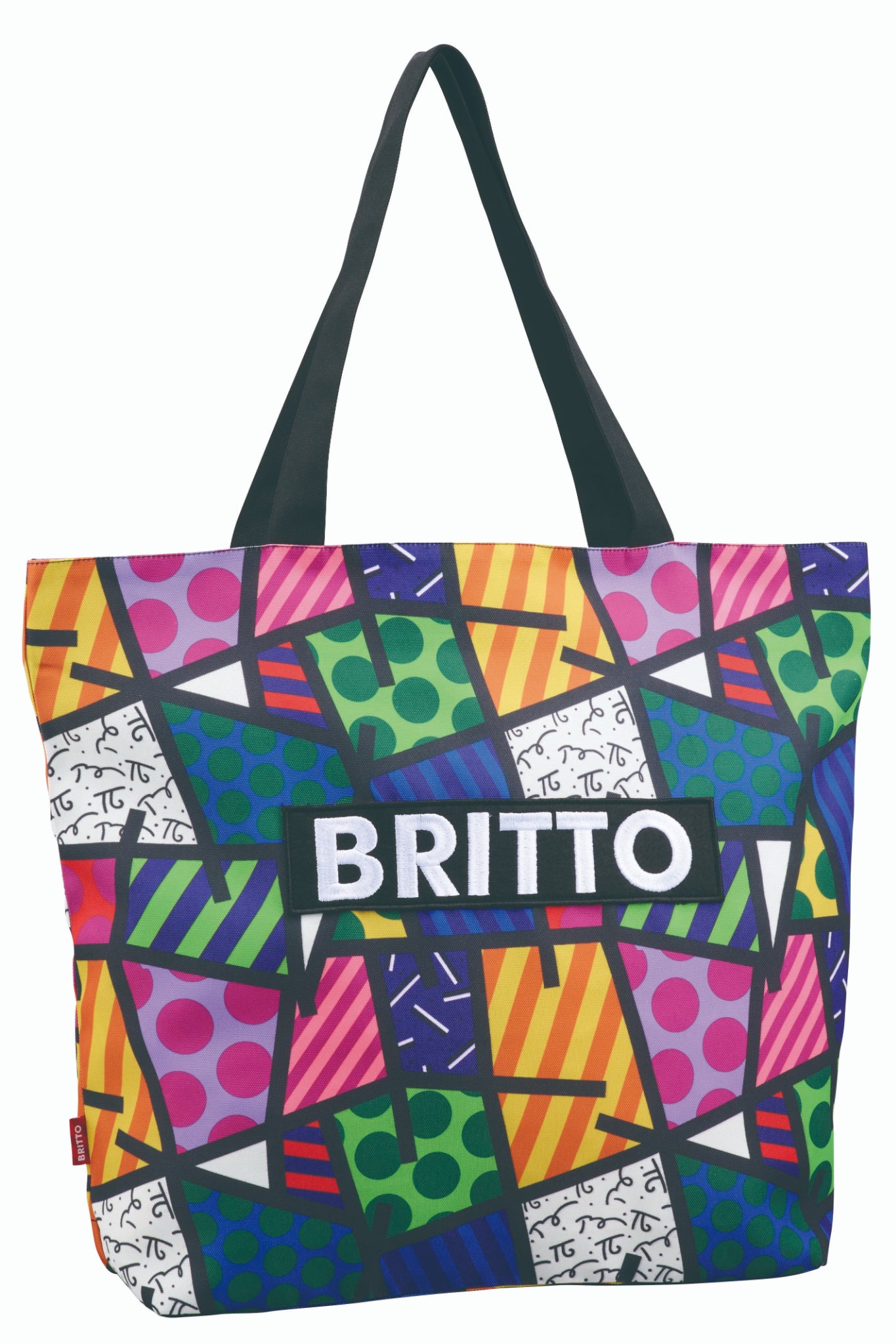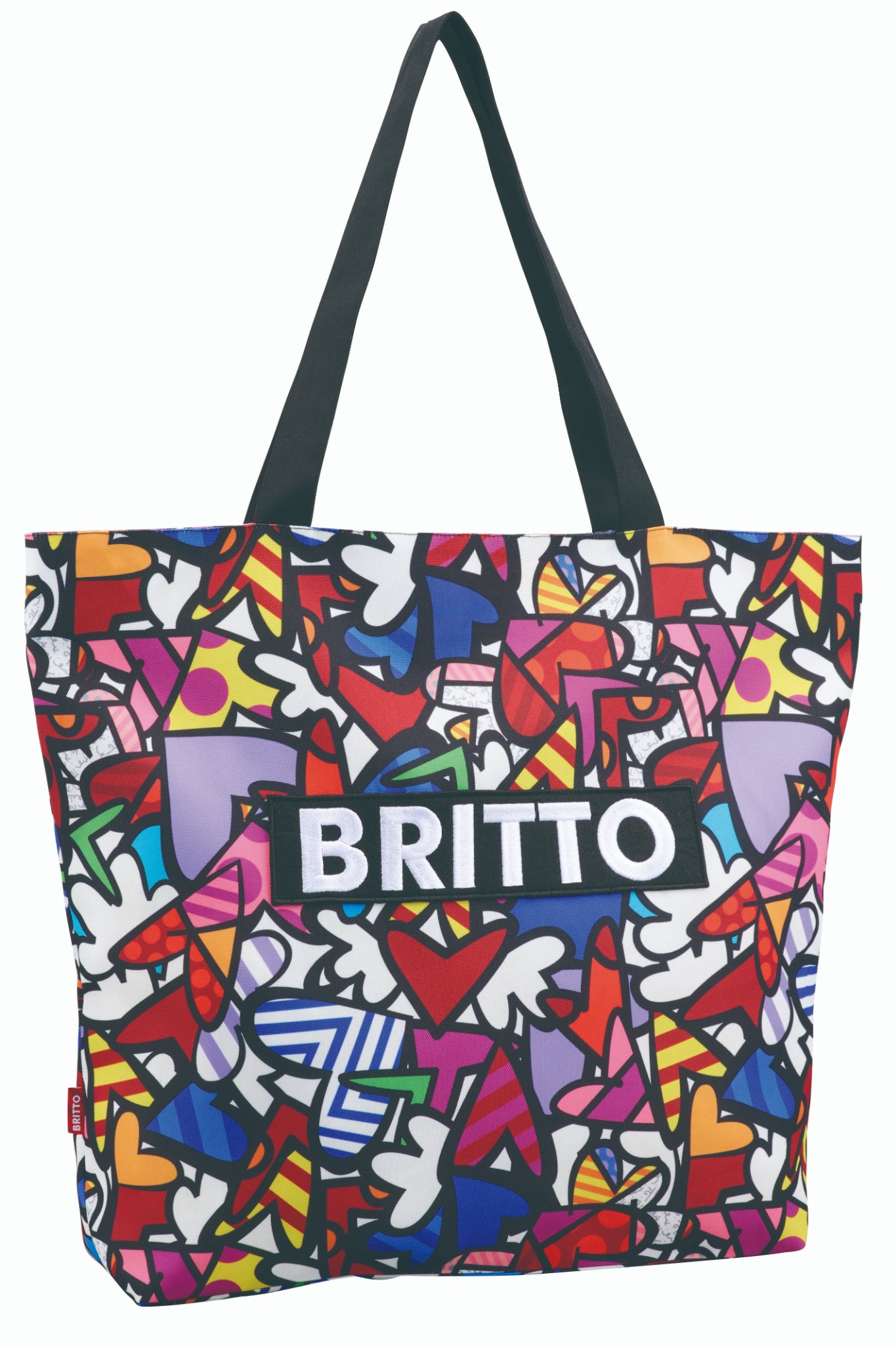 ロメロ・ブリット(Romero Britto)のデザインが印象的な肩掛けができるトートバッグ。内ポケット2個付き。